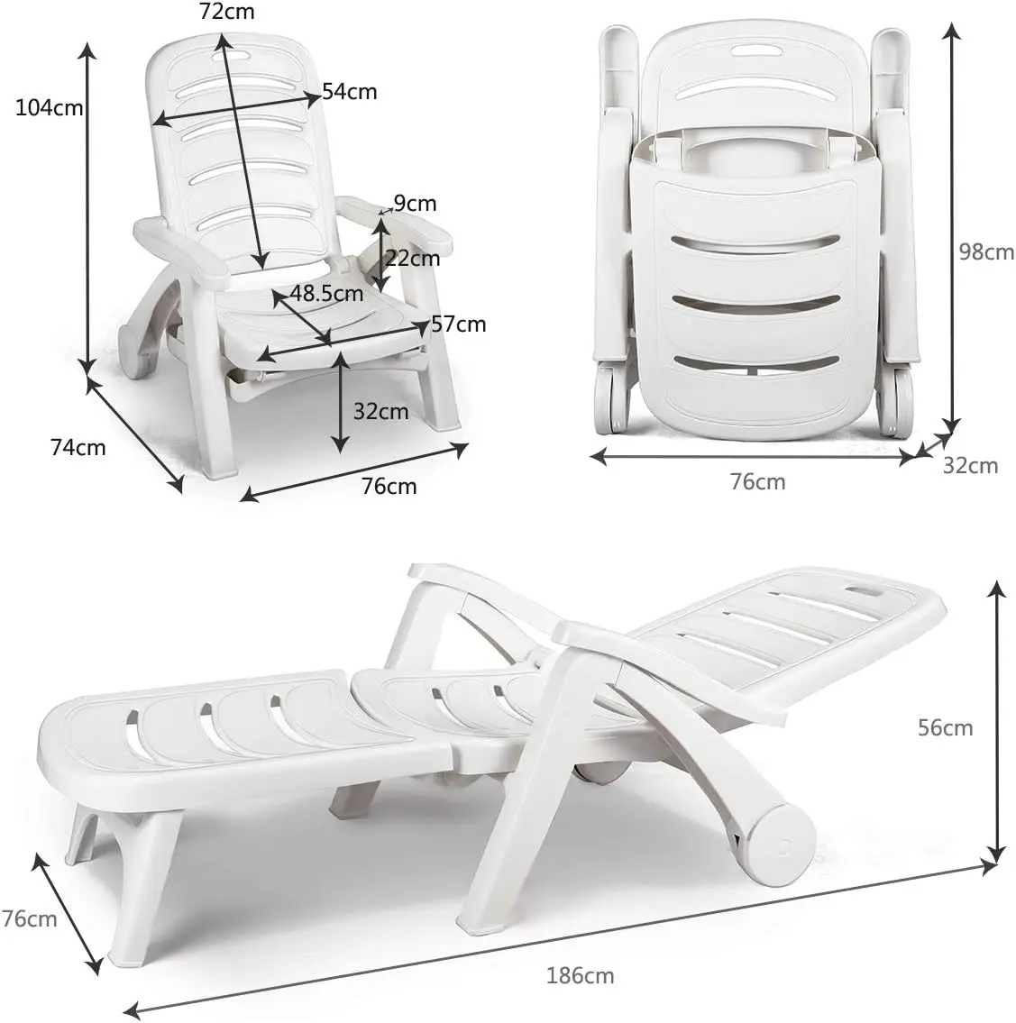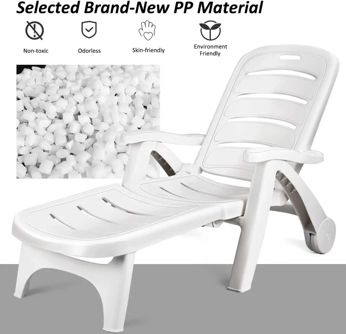 Our folding lounge chair is an ideal choice for you to enjoy leisure time. It is designed with 5 adjustable levels, so you can adjust the height of the backrest to different positions. Coming with curved armrests and a hollow backrest, this chair can effectively relieve the fatigue of the body and promote air circulation. Crafted with PP frame, our lounge chair is durable and weather-resistant for outdoor use. In addition, foldable design makes it easy to store when not in use, which will save plenty of space. Equipped with two smooth-rolling casters, this recliner is easy to move anywhere you need. This well-designed lounge chair is ideal for indoor and outdoor use. Don't hesitate to buy it now!