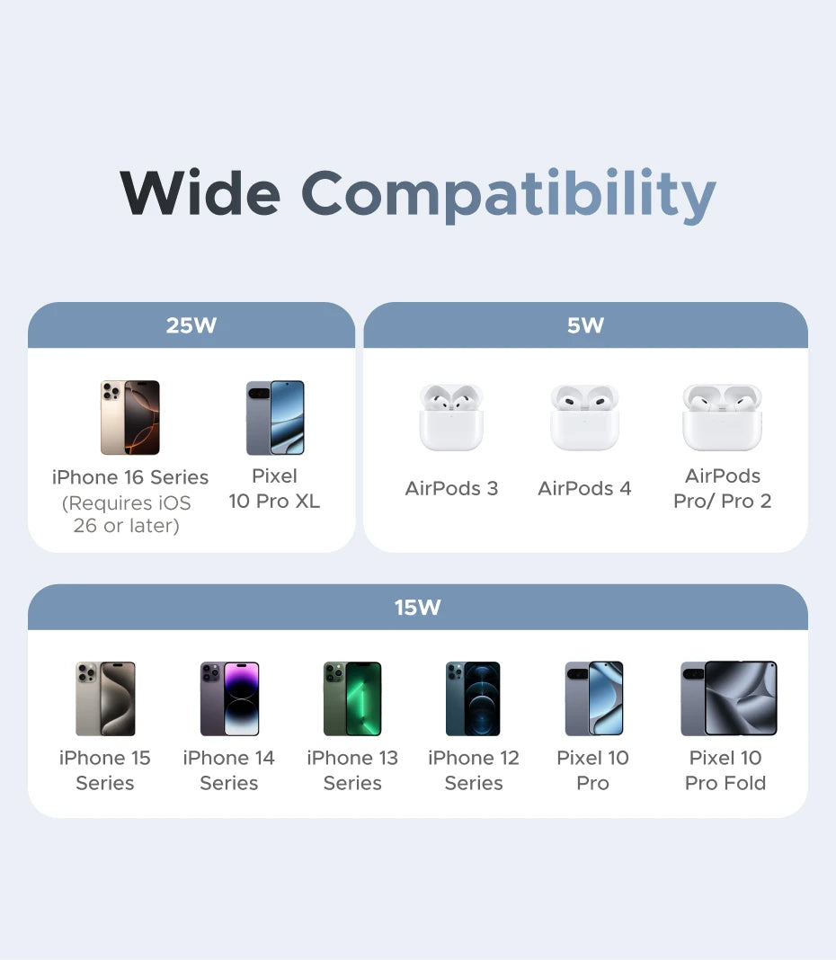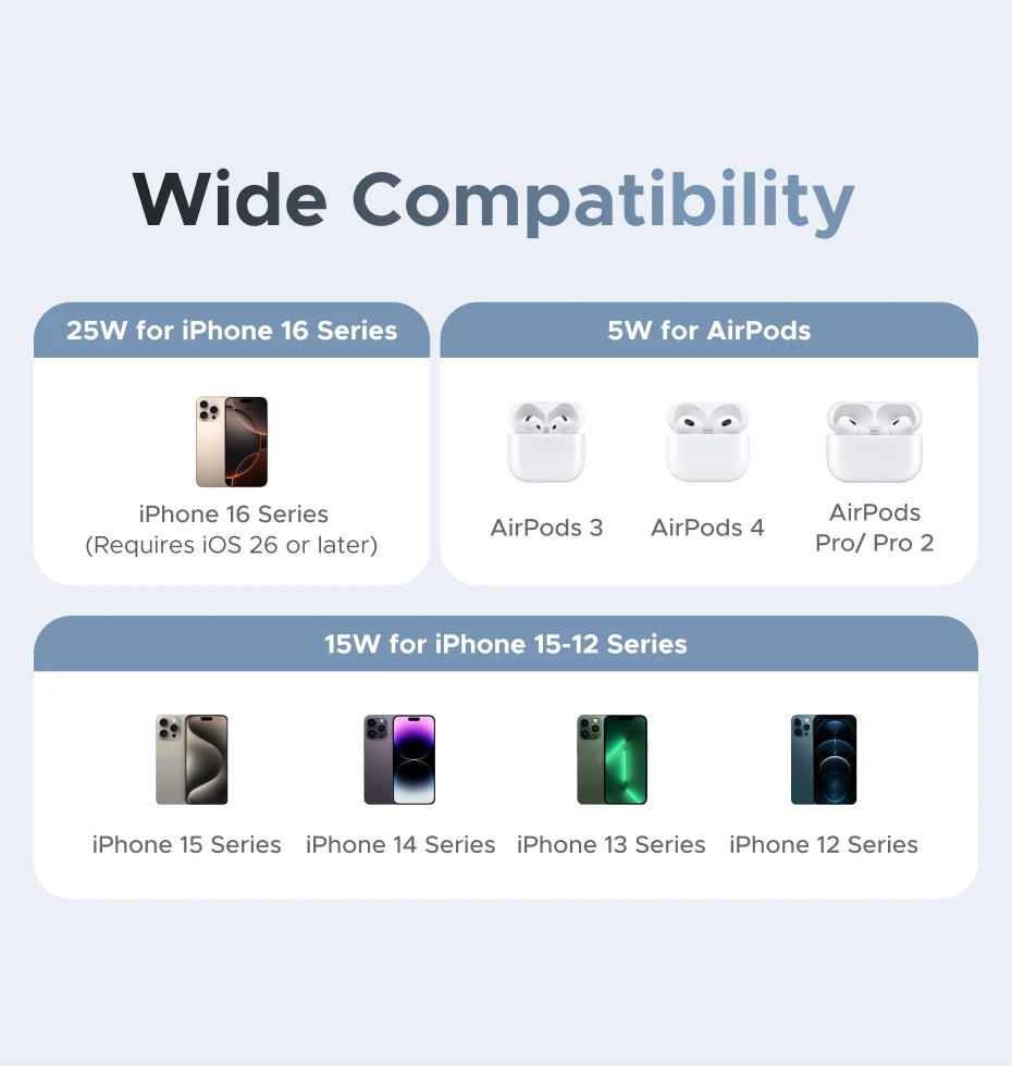 Qi2 25W-certified devices support up to 25W. iPhone Air and iPhone 16/16 Pro may